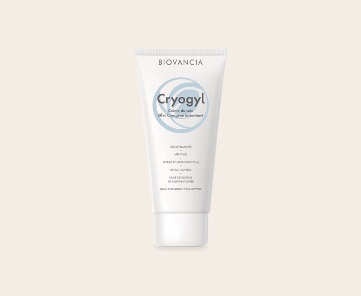 Cryogyl (Biovancia) : crème cosmétique 75 ml à 6 actifs végétaux (harpagophytum 3 %, menthol, menthe poivrée, eucalyptus, prêle, argile blanche) pour un geste local frais et apaisant au quotidien.